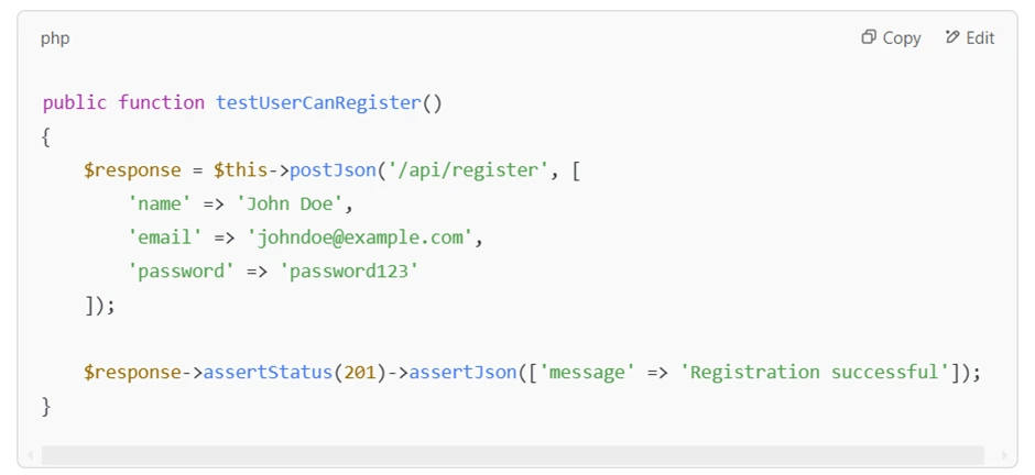 API testing offers consistent and reliable results. Laravel has built-in tools such as PHPUnit and HTTP testing for it. By conducting unit testing, you can test the individual API components. For example,