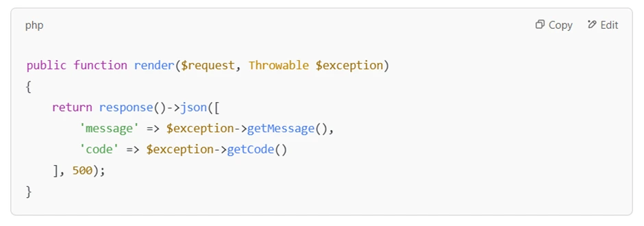 You can use Laravel’s class to customize error responses. For example, you can create a user-friendly JSON response for exceptions like this:
