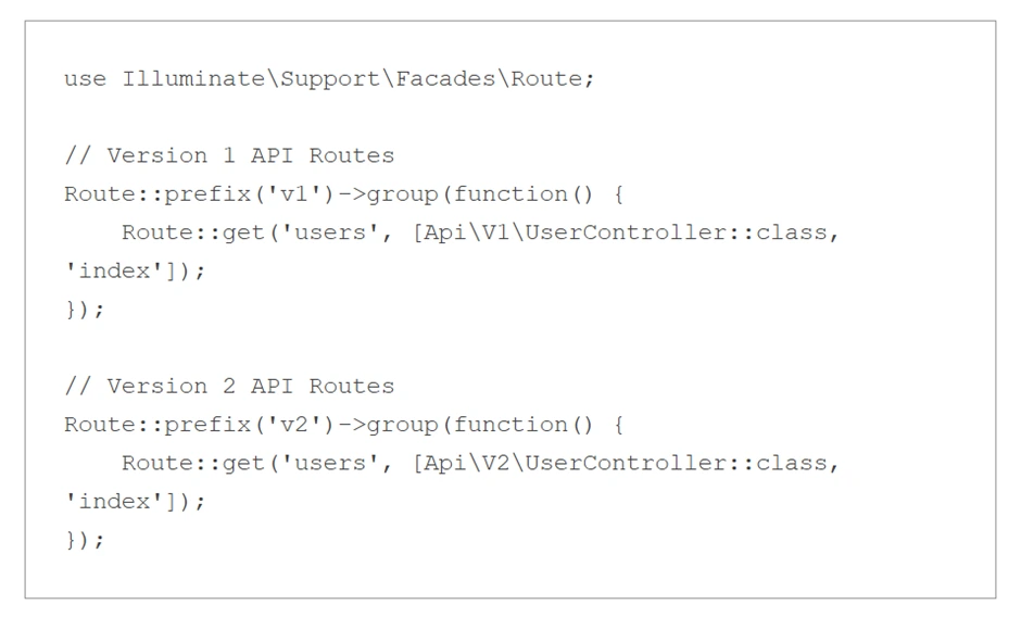 It is important and best practice to ensure that API remains compatible with the previous version as it evolves. To version your API, Laravel supports prefixing route with version numbers. Therefore, you can easily introduce new changes without breaking existing functionalities. You can prefix the route with v1, v2, which indicates different API versions. You should use the separate controller namespace for each version. Make use of a separate controller namespace for each version.